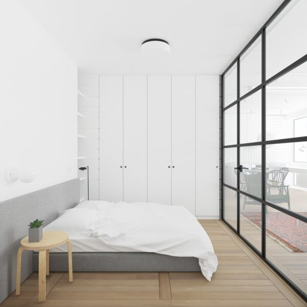The bedroom was designed so as not to clash with the rest of the apartment. Instead it is like a little bubble that mirrors the rest of the home’s design. The Ikea Frosta Stool serves as a nice side table in this this very minimalist bedroom.