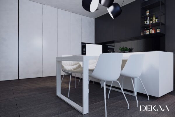 Have the best of the black and white kitchens with a dining room to match. This unconventionally-shaped design uses stripes of both black and white across an origami chandelier, horizontal pendant light and stunning kitchen bench to help expand aesthetics.